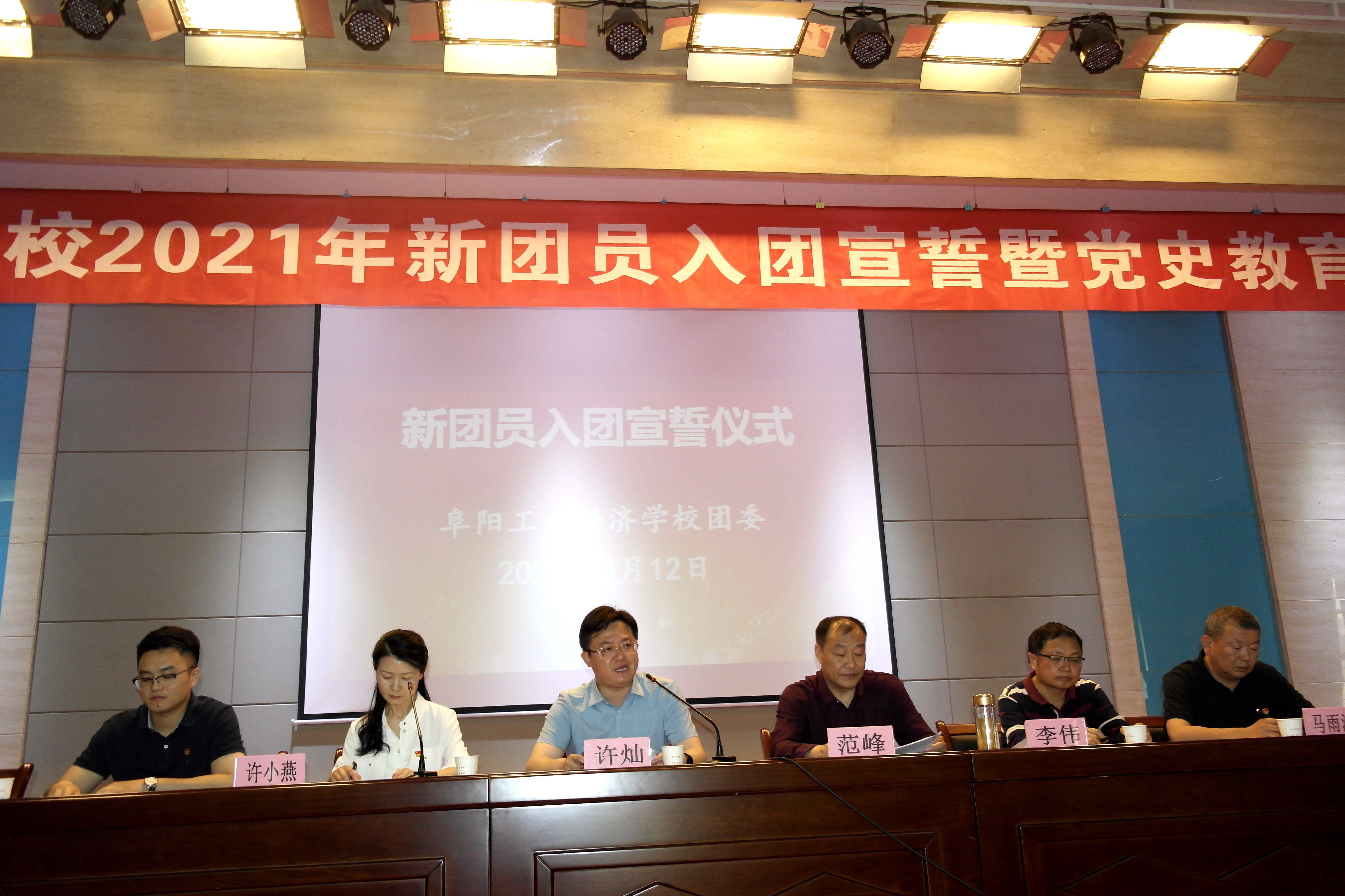 5月12日,“传承红色基因 勇担时代使命”2021年阜阳工业经济学校新团员集中入团宣誓仪式暨学党史教育宣讲大会在多功能厅举行。共青团阜阳市委副书记许灿,阜阳工业经济学校副校长范峰、相关科室负责人、学生党支部党员、校团委委员及教师和团员代表三百余人参加了活动。