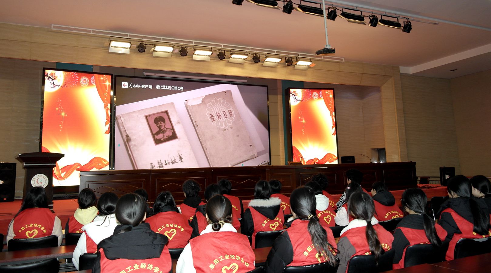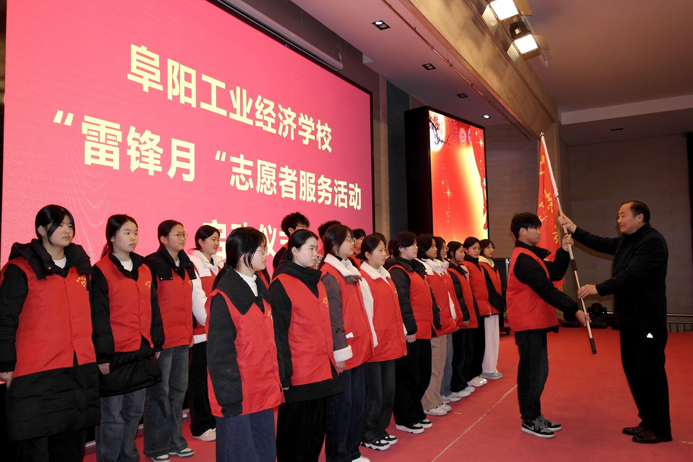 3月5日,阜阳工业经济学校“雷锋月”志愿者服务活动启动仪式在报告厅隆重举行。校党委委员、副校长范峰向青年志愿者代表授“学雷锋志愿服务队”队旗。鲜红的旗帜迎风飘扬,象征着雷锋精神代代相传的责任与使命。范峰勉励志愿者们:接过这面旗,就要扛起新时代青年的担当,书写新时代的雷锋故事,自觉做雷锋精神的传承者和践行者。