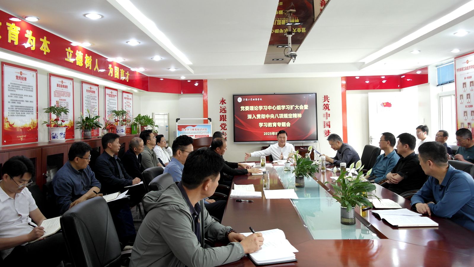 5月9日,阜阳工业经济学校召开党委理论学习中心组学习扩大会暨深入贯彻中央八项规定精神学习教育专题学习会,校党委书记周波主持会议,校班子成员、各科处室负责人参加会议。