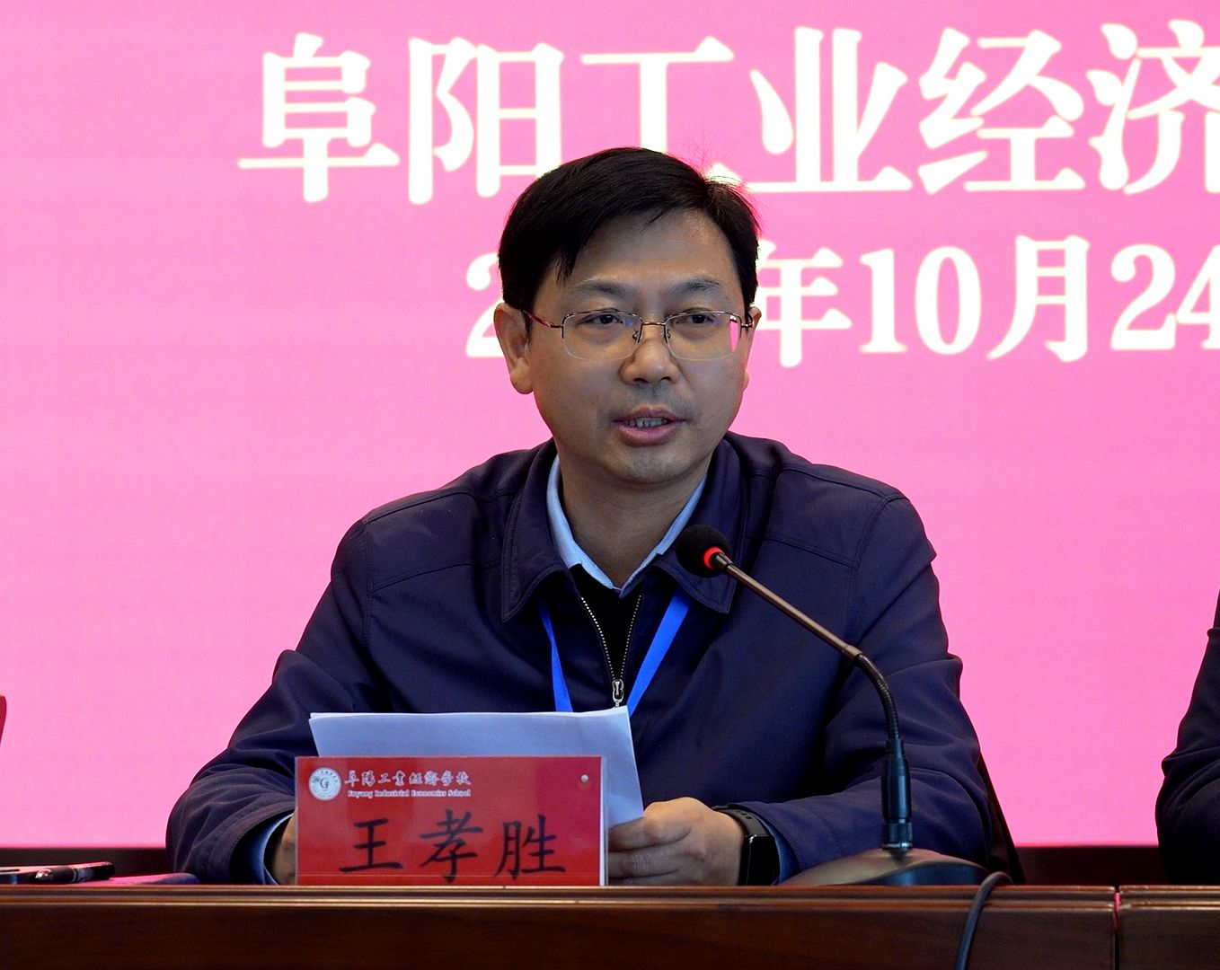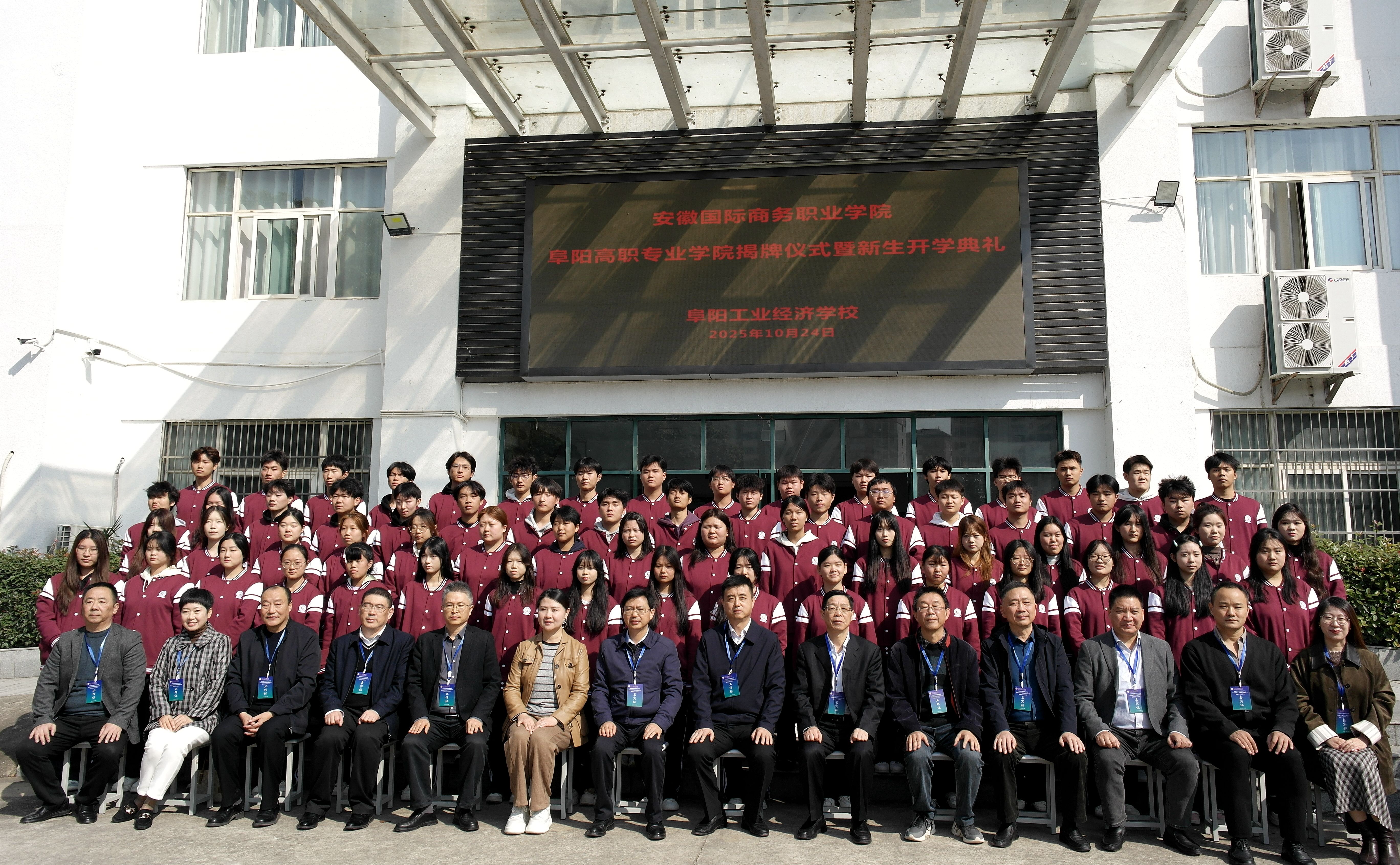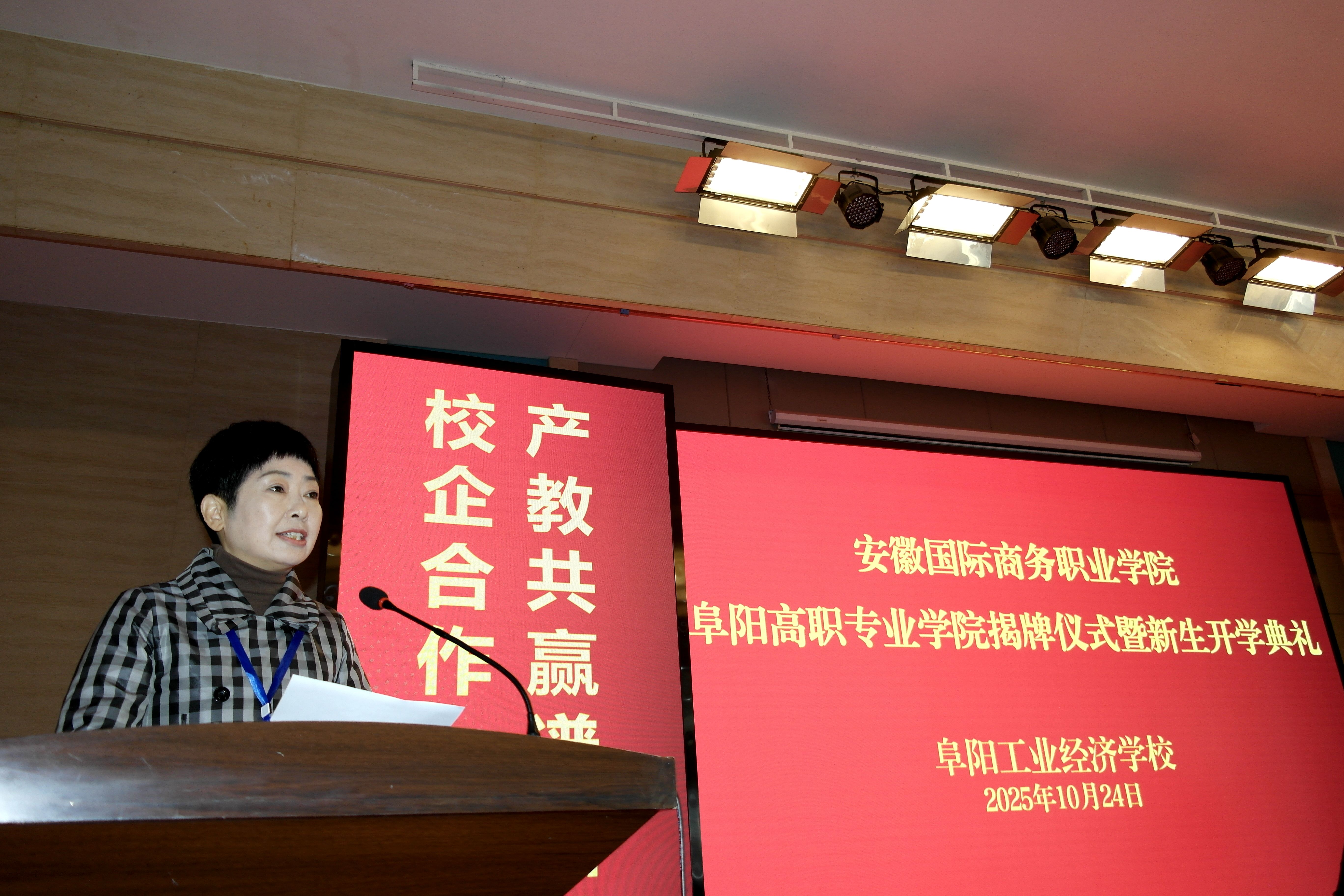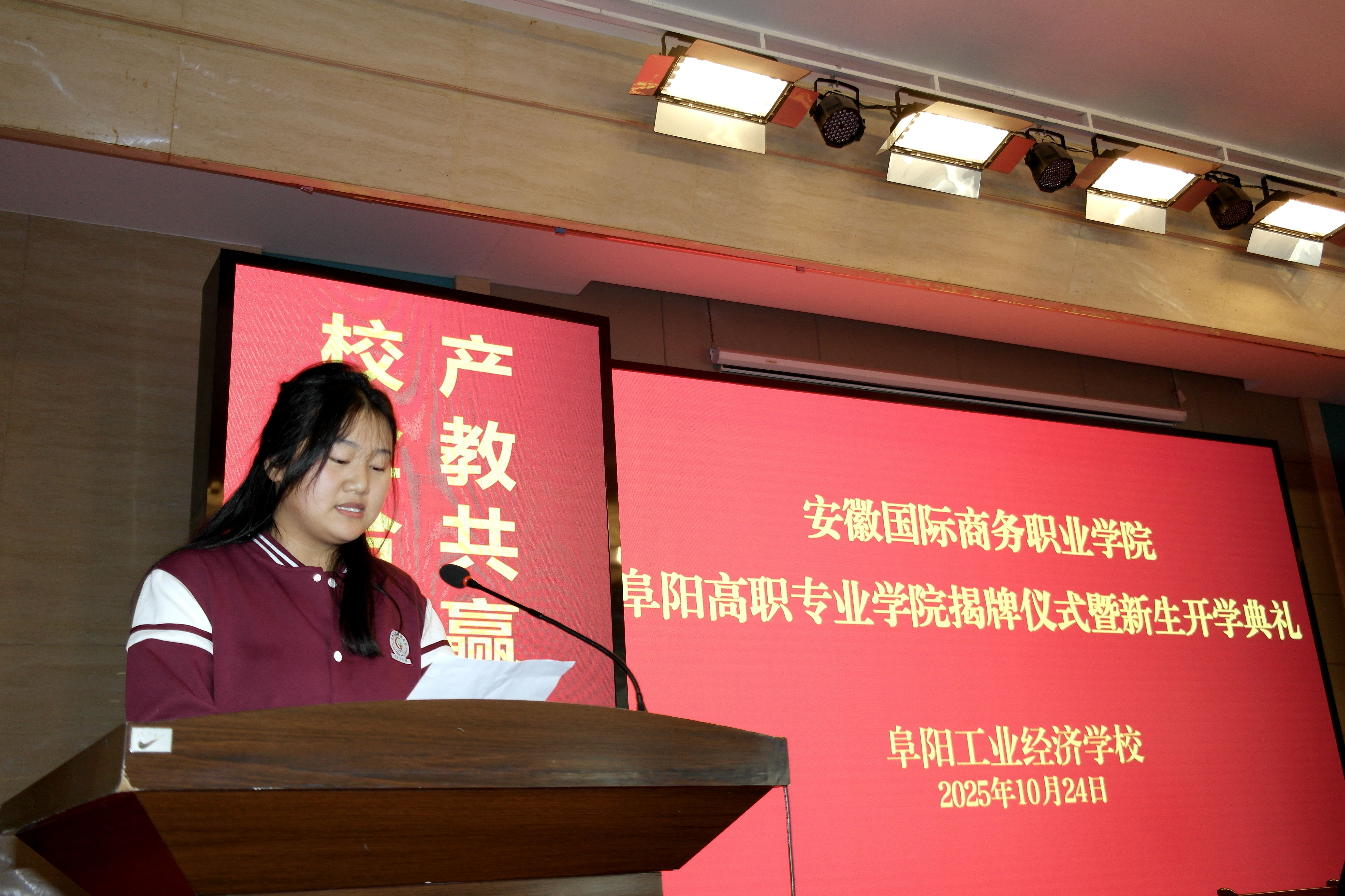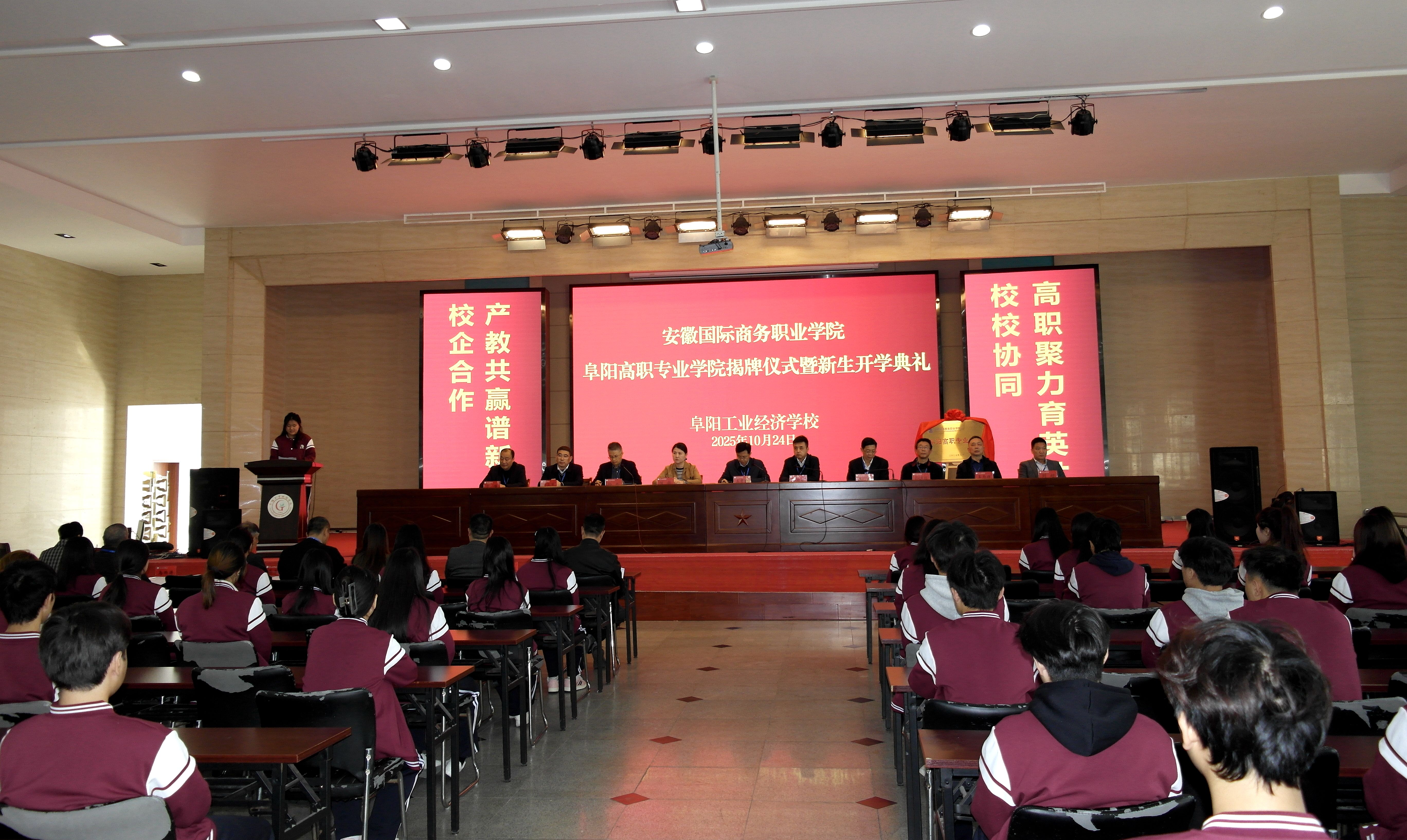 金秋十月,硕果飘香。10月24日,由安徽国际商务职业学院与阜阳工业经济学校合作共建的阜阳高职专业学院揭牌仪式暨首届新生开学典礼,在阜阳工业经济学校礼堂隆重举行。安徽国际商务职业学院党委副书记、校长王孝胜,党委委员、副校长李二敏,安徽图联科技有限公司副总裁陈华,阜阳工业经济学校党委书记陈颍峰,党委副书记、校长孙杰及校党委班子成员,高职专业学院教师代表与2025级数字媒体技术全体新生齐聚现场,共同见证这一承载教育梦想与未来期许的重要时刻,标志着阜阳工业经济学校在中高贯通培养、深化产教融合、创新高素质技术技能人才培养模式上迈出关键一步。