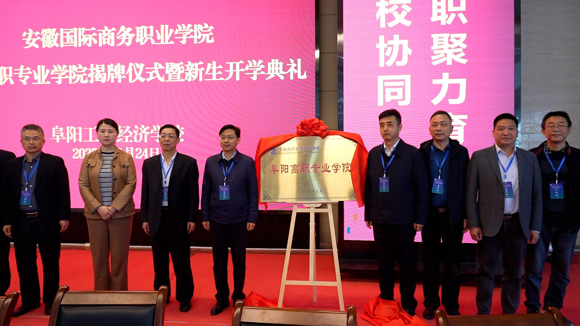 在全场期待中,安徽国际商务职业学院与阜阳工业经济学校领导共同上台,为“阜阳高职专业学院”揭牌。红色幕布缓缓落下,牌匾在灯光下熠熠生辉,现场掌声雷动——这掌声既是对学院成立的祝贺,更是对两校合作、产教融合未来的期许。此次揭牌,标志着阜阳高职专业学院正式进入实质性办学阶段,为阜阳职业教育注入新活力,也为当地产业升级与经济发展提供更强人才支撑。