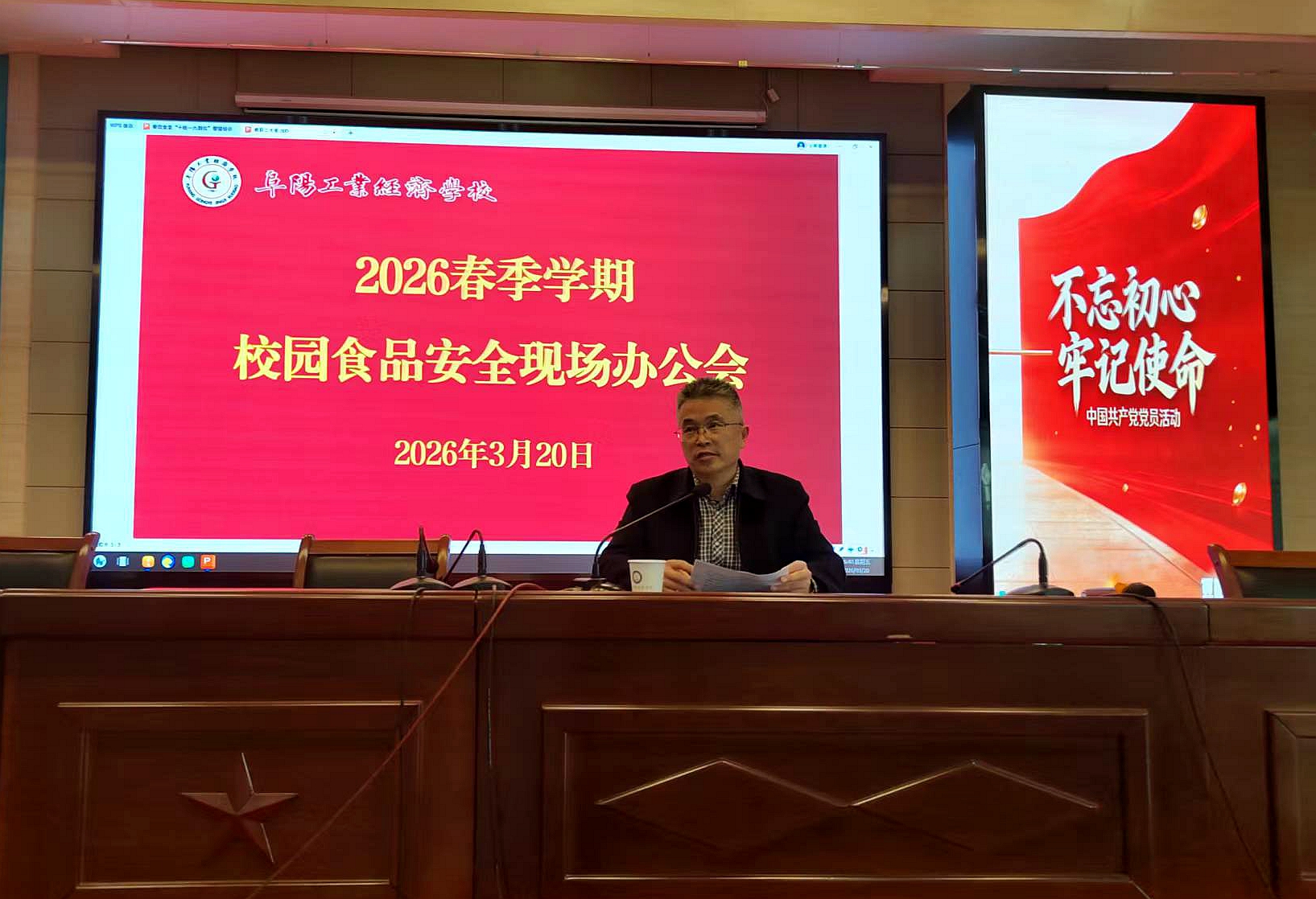 为全面贯彻落实国家校园食品安全工作相关部署,压紧压实校园食品安全主体责任,全面排查食品安全风险隐患,切实保障全校师生饮食安全与身体健康,3月20日,我校召开2026年春季学期校园食品安全现场办公会与专题培训会。校党委副书记、校长孙杰,颍南市场监管所所长李玺,学校食品安全办公室工作人员及两校区食堂全体从业人员参加本次会议。