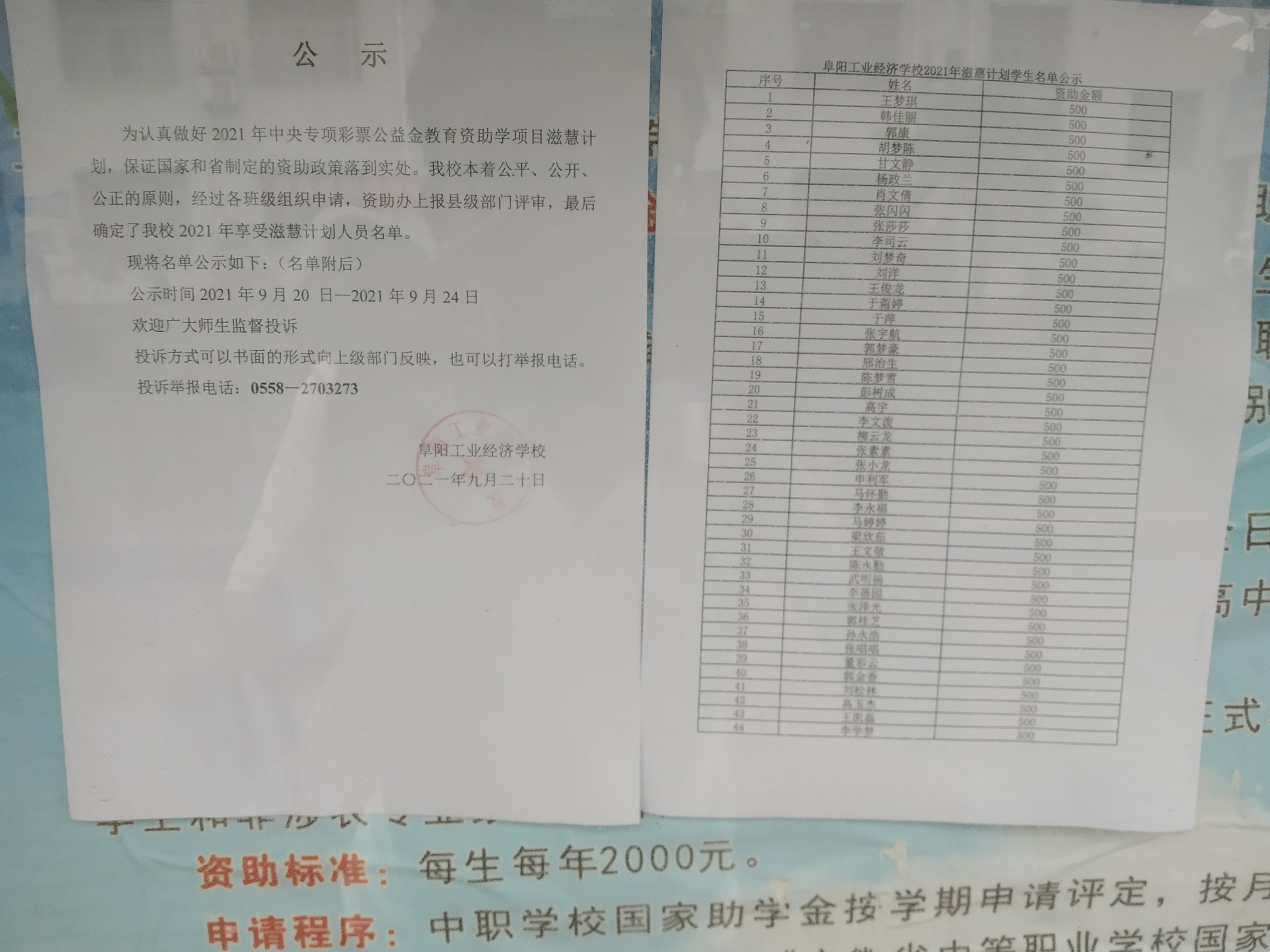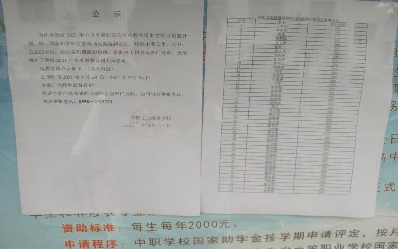 阜阳工业经济学校2021年滋蕙计划学生名单公示