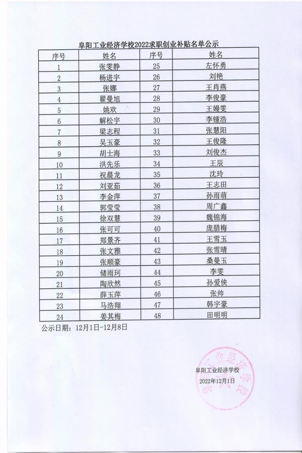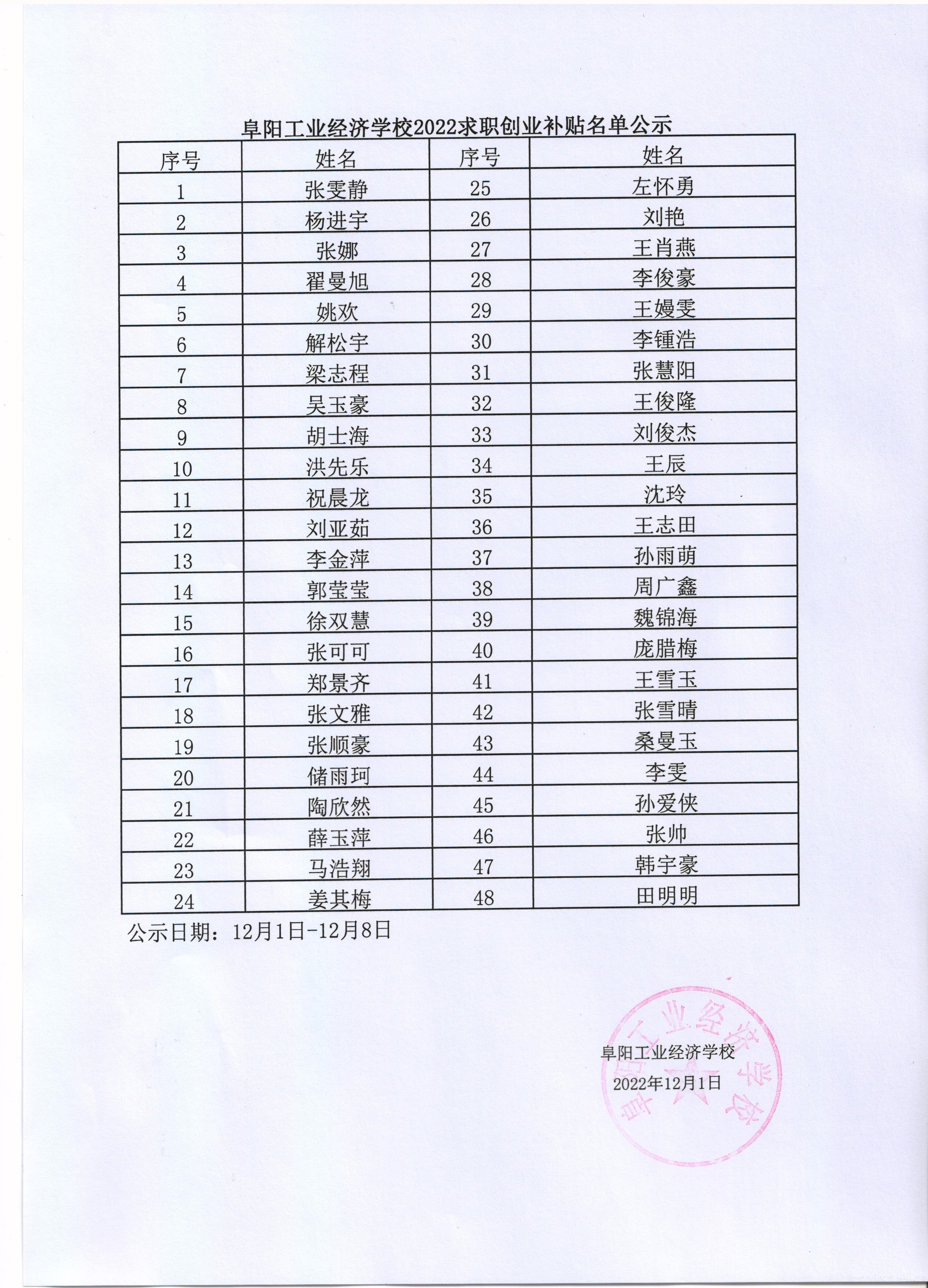 阜阳工业经济学校 2022年秋季学期资助、免学费公示