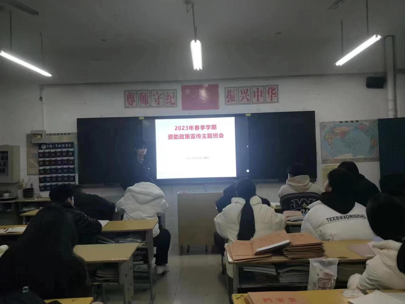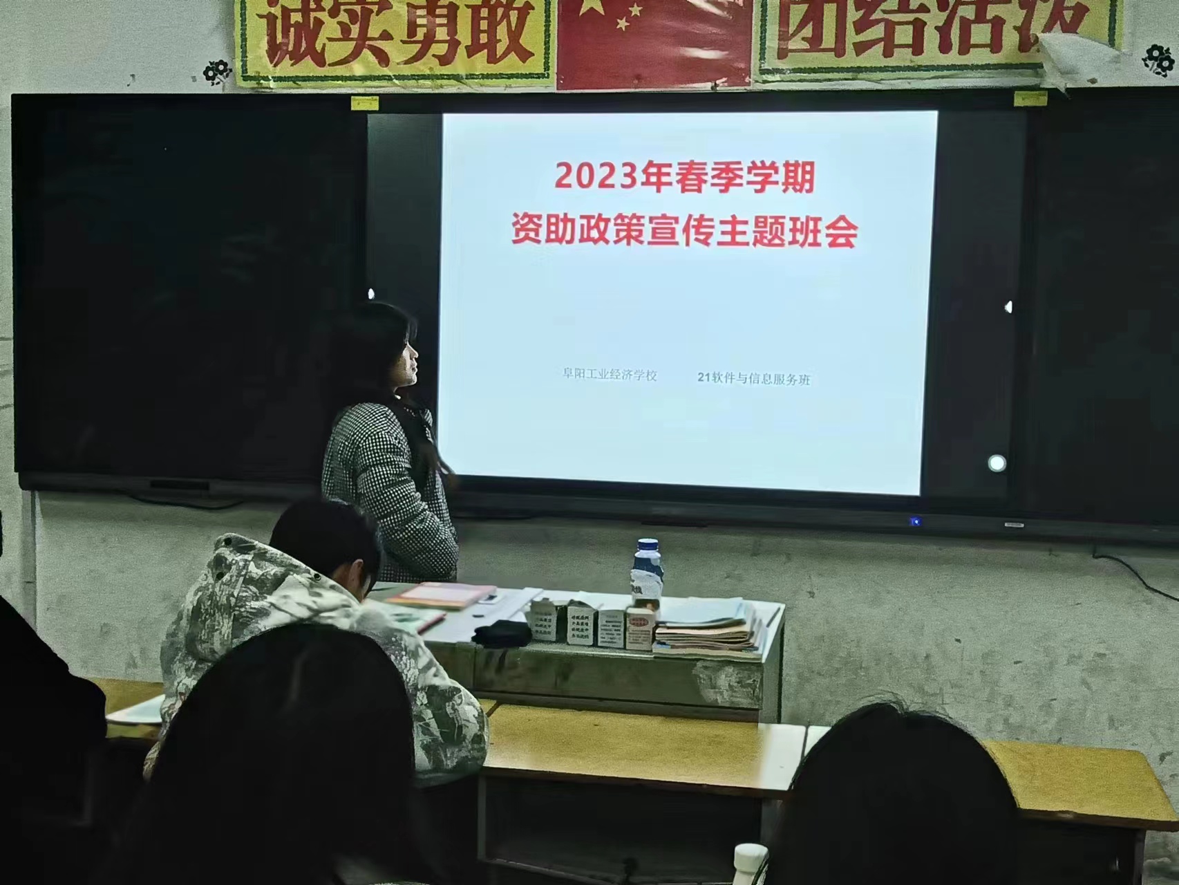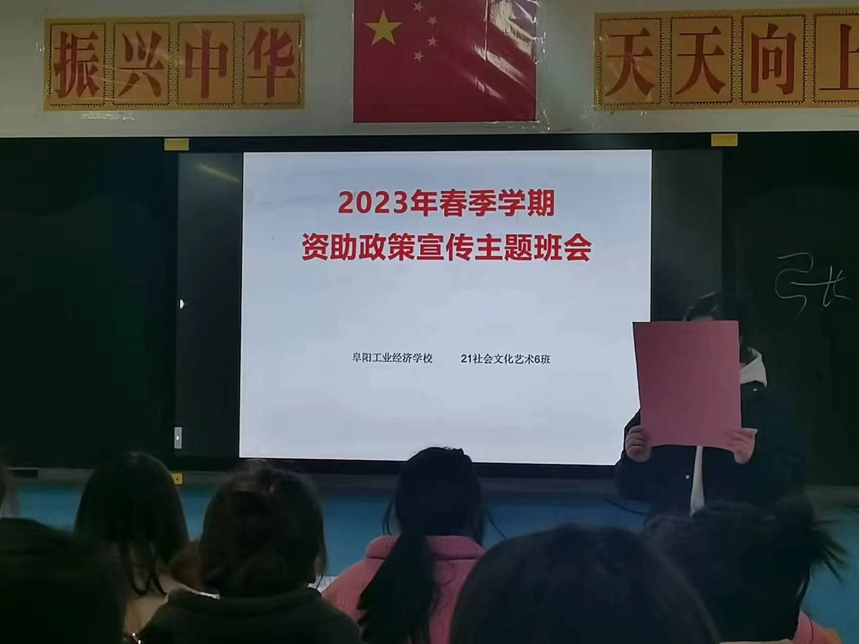 阜阳工业经济学校2023年春季学期各班级利用晚自习时间开展了学生资助政策宣传第一课主题班会活动。