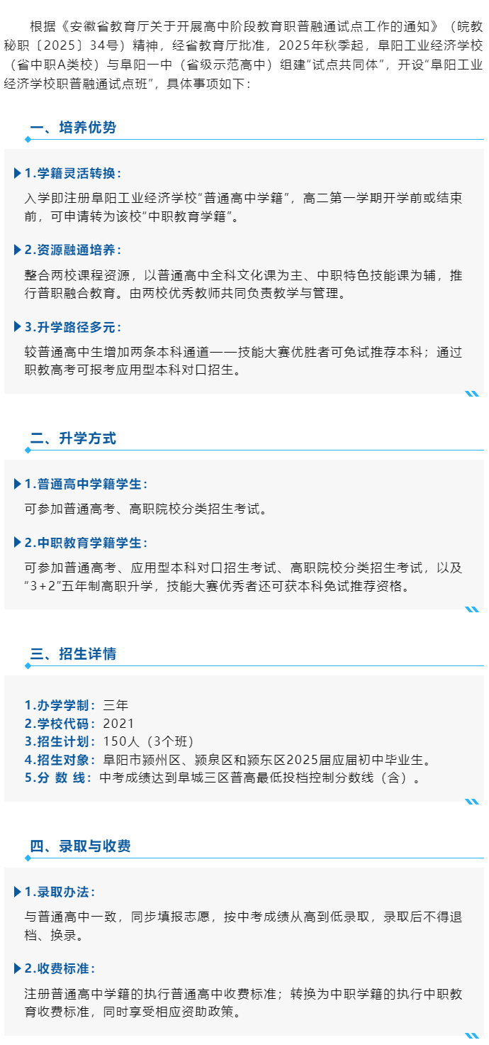 阜阳工业经济学校职普融通试点班2025年招生简章